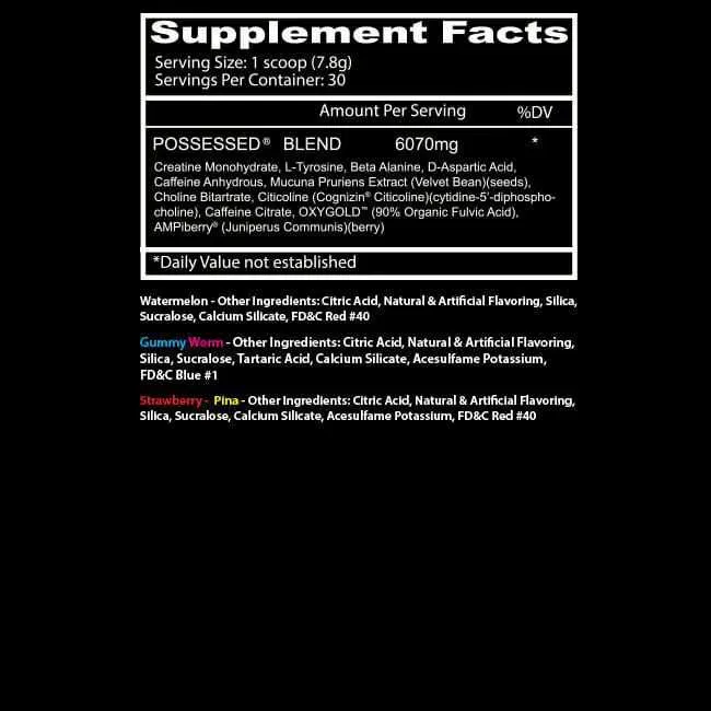 Possessed es un pre-entreno de alta intensidad diseñado para aumentar la energía, fuerza, resistencia y enfoque mental durante los entrenamientos. Contiene cafeína, beta-alanina, creatina, L-tirosina y ácido D-aspártico, además de compuestos como AMPiberry® y OXYgold™ que mejoran la absorción. Está ...